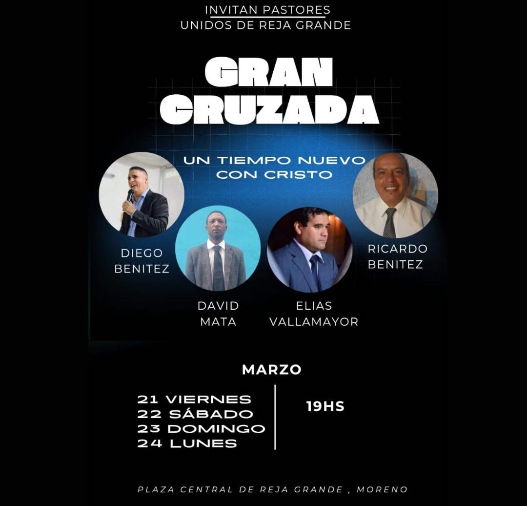 En un mundo lleno de desafíos, Dios nos llama a un tiempo nuevo. Te invitamos a esta Gran Cruzada, un encuentro de fe, renovación y milagros. Ven a recibir un mensaje de esperanza, alabanza y restauración de la mano de Pastores Unidos de Reja Grande.